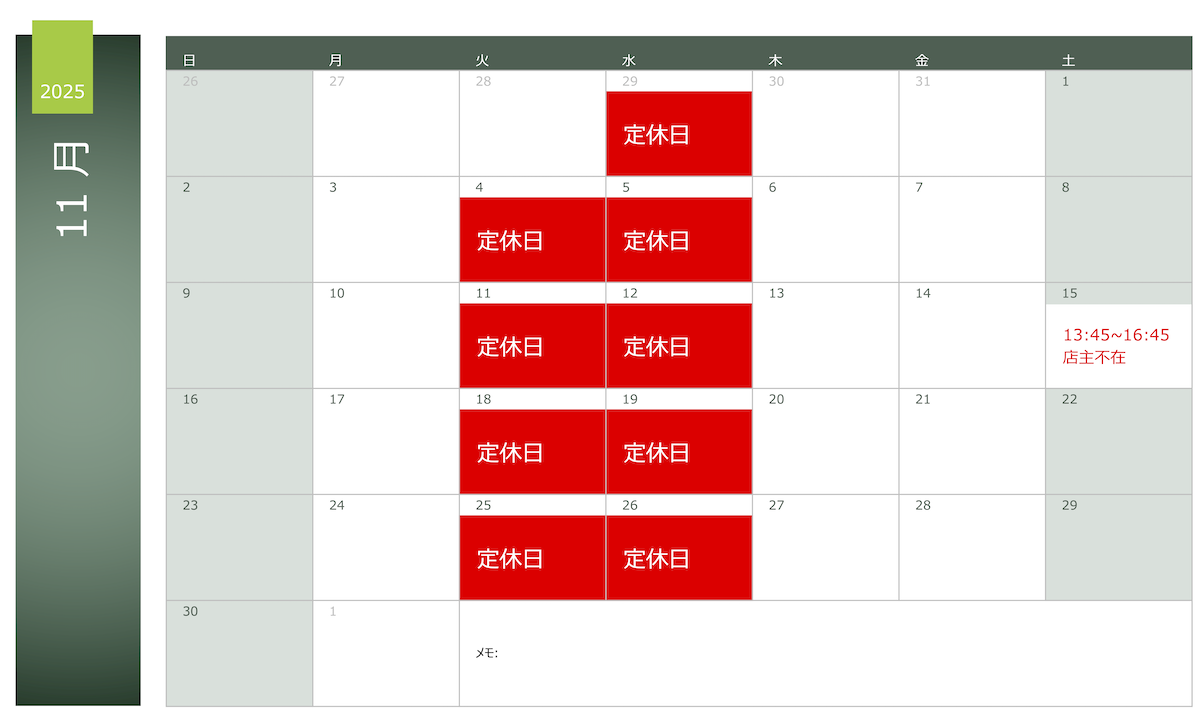 11月1日より3月末までは、冬期の定休日・営業時間となります。