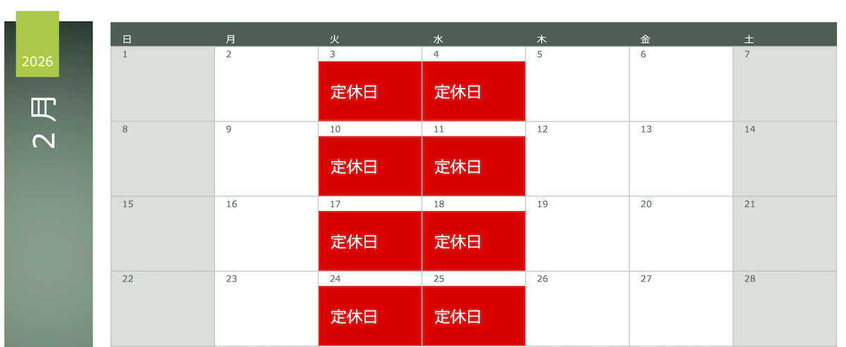 2月の営業スケジュール 2026.02.01 🗓 2月の営業スケジュールのお知らせ 臨時休業など無く通常通り営業いたします。 2月11日(水)建国記念の日は祝日ですが、水曜日のため通常通り定休日とさせていただきます。