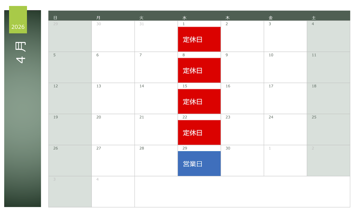 • 水曜日の定休日ですが祝日のため営業いたします(10時〜19時)